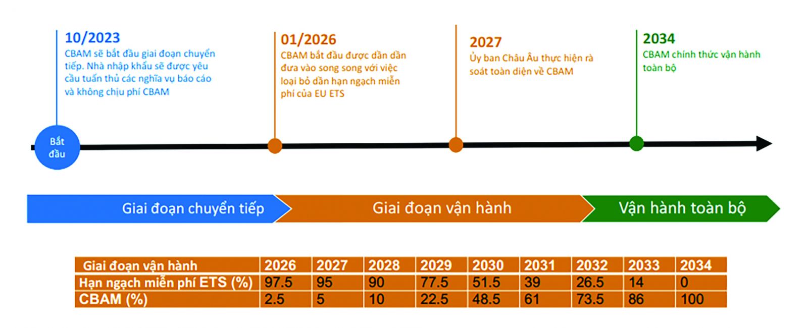Thực hiện CBAM, EU có đưa ra lộ trình tuân thủ chứ chưa yêu cầu thực hiện ngay. Trong đó, giai đoạn chuyển tiếp có hiệu lực từ ngày 01/10/2023, các nhà nhập khẩu có nghĩa vụ báo cáo theo quy định vào cuối mỗi quý phát thải được ghi trong hàng hóa CBAM mà không phải thanh toán mức chi phí điều chỉnh, dành thời gian cho việc hoàn thiện hệ thống. Sau giai đoạn thí điểm, CBAM được thực hiện đầy đủ từ năm 2026, các doanh nghiệp có nghĩa vụ báo cáo lượng khí thải carbon và nộp “thuế” carbon hiện hành. Theo đó, sản phẩm nào có mức độ phát thải khí nhà kính trong quy trình sản xuất vượt quá mức quy định, thị trường EU yêu cầu các nhà nhập khẩu phải trả tiền mua chứng chỉ carbon hoặc trả tiền thuế cho carbon được đánh giá trên sản phẩm nhập khẩu vào EU.