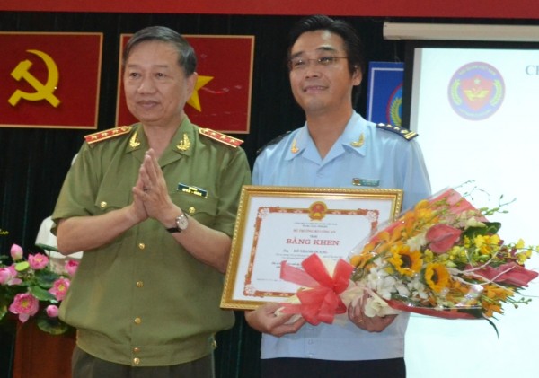 | Thượng tướng Tô Lâm trao bằng khen cho ông Đỗ Thanh Quang, Chi cục trưởng Chi cục Hải quan cửa khẩu sân bay quốc tế Tân Sơn Nhất. |