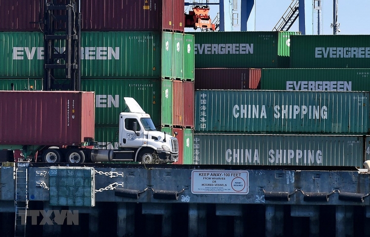 | Bốc dỡ container hàng hóa của Trung Quốc và một số quốc gia khác ở cảng Long Beach, Los Angeles (Mỹ) tháng 2/2019. (Ảnh: AFP/TTXVN) |