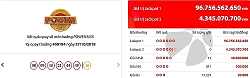 Tại kỳ quay số mở thưởng (QSMT) thứ 194 sản phẩm xổ số tự chọn Power 6/55, Công ty Xổ số điện toán Việt Nam (Vietlott) xác định có 1 vé trúng thưởng Jackpot 1 trị giá hơn 96,7 tỷ đồng (chưa khấu trừ thuế thu nhập cá nhân theo quy định nhà nước) được phát hành tại TP HCM sau gần 3 tháng không có khách hàng trúng thưởng. Tấm vé may mắn được phát hành tại điểm bán hàng số 464A Minh Phụng, phường 9, quận 11, TP HCM. Ngoài giải độc đắc, kỳ quay lần này còn ghi nhận 15 vé trúng giải nhất trị giá 40 triệu đồng, hơn 800 giải nhì và 17.200 giải ba. Theo Vietlott, đây là vị khách hàng thứ 3 trúng Jackpot 1 Power 6/55 cũng như là vị khách thứ 47 trúng Jackpot của 2 sản phẩm Mega 6/45 và Power 6/55 tại TP HCM kể từ khi Vietlott triển khai.