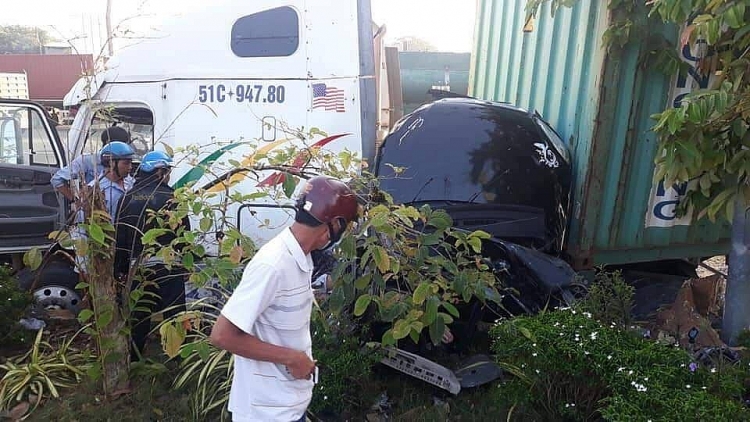Container húc ôtô bẹp dúm, 5 người tử vong