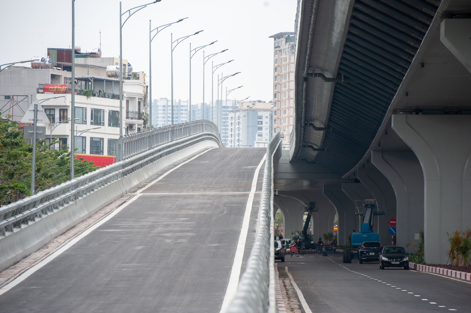 Phần đường dưới thấp kéo dài từ Vĩnh Tuy - Chợ Mơ - Ngã Tư Vọng dài 3,1km được mở rộng với mặt cắt 53,5 - 63,5m, quy mô 8 làn xe (6 làn dành cho xe cơ giới và 2 làn xe dành cho xe thô sơ), có dải phân cách rộng 4m ở giữa và vỉa hè rộng 4 - 6m mỗi bên. Hiện tại, cơ bản đường dưới thấp đã được thi công xong và đưa vào sử dụng.