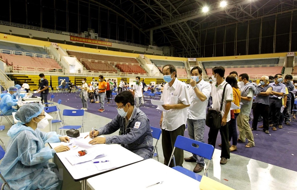 | Người lao động xếp hàng chờ thực hiện các thủ tục khai báo y tế trước khi tiêm vaccine phòng COVID-19 tại Nhà thi đấu Phú Thọ. (Ảnh TTXVN) |