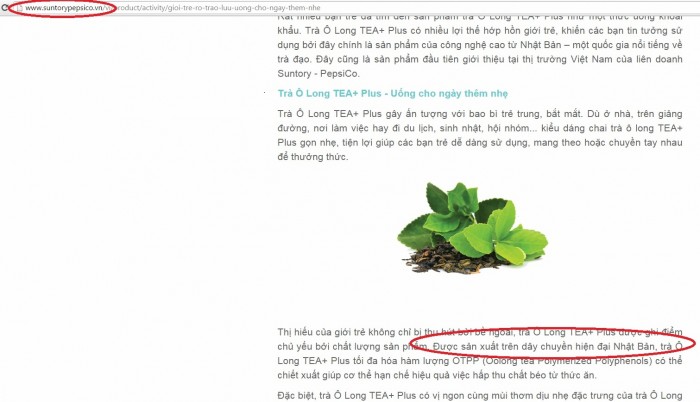 Trên trang web của Suntory Pepsico Việt Nam quảng cáo rầm rộ việc trà Ô long TEA + Plus được sản xuất trên "dây chuyền hiện đại Nhật Bản" bằng những mỹ từ: