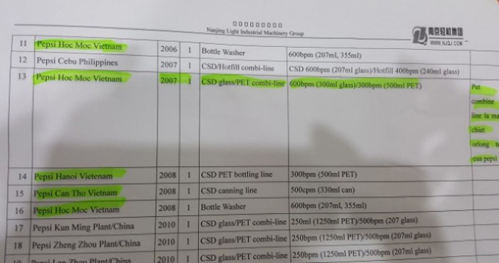 Tuy nhiên, theo tài liệu bán hàng của công ty lắp máy Nanjing, Trung Quốc có ghi rõ danh sách khách hàng của công ty này là Suntory Pepsico Việt Nam. Pepsico Việt Nam sử dụng máy móc của Nanjing trong nhiều nhà máy ở Hà Nội, Cần Thơ, TP HCM.