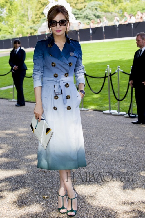 Triệu Vy diện một thiết kế trenchcoat màu xanh ombre lạ mắt của Burberry, kết hợp với sandal cùng tone, kính mắt đen oversized và clutch trắng.