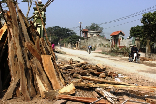 Nguyên liệu làm trống Đọi Tam chủ yếu là gỗ mít và da trâu. Đi từ đầu làng có thể bắt gặp những đoạn gỗ to xếp trên đường.