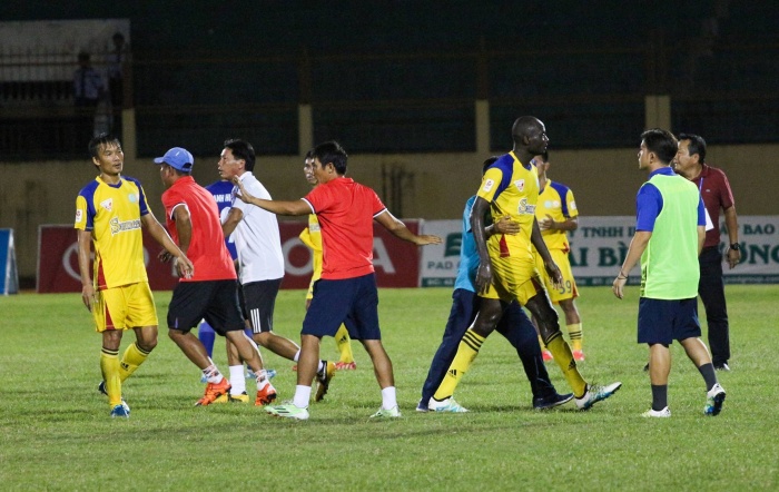 | Đến trọng tài đẳng cấp FIFA mà còn thế này... Trọng tài FIFA Phùng Đình Dũng mắc lỗi khiến Khánh Hoà nhận bàn thua oan. Ông Dũng là trọng tài được công nhận đẳng cấp FIFA. |