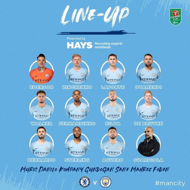 * Man City: Ederson; Zinchenko, Laporte, Otamendi, Walker, Fernandinho, Silva, De Bruyne, Bernardo, Sterling, Aguero.
