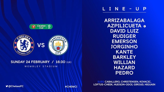 * Chelsea: Kepa; Azpilicueta, Luiz, Ruediger, Emerson, Jorginho, Kante, Barkley, Willian, Pedro, Hazard
