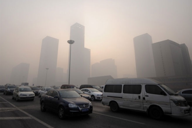 Bắc Kinh đã trải qua mức ô nhiễm không khí cao chưa từng có vào cuối tuần qua. Điều này phản ánh những thách thức kéo dài mà nền kinh tế lớn thứ nhì thế giới phải đối mặt trong vấn đề môi trường. Trong ảnh, xe cộ đang di chuyển trong làn khói dày đặc gần quận trung tâm của Bắc Kinh