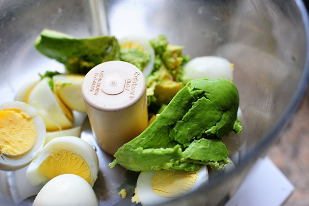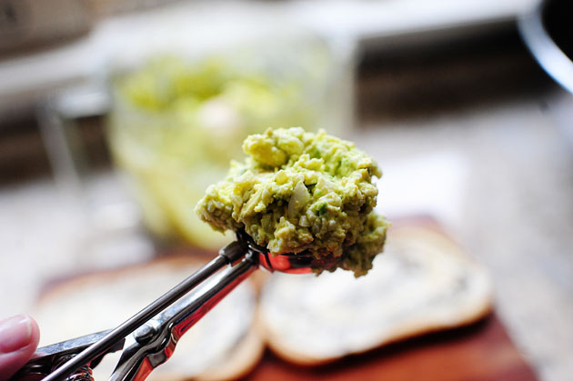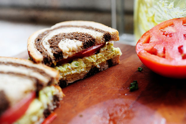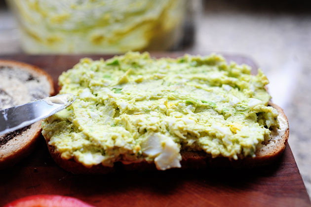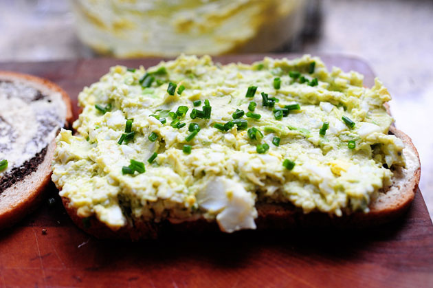 Món ăn được dùng kèm với bánh mì. Bạn phết hỗn hợp mù tạt và mayonnaise lên bánh mì một lớp mỏng. Sau đó, lấy khoảng 1 muỗng canh phần nhân gồm bơ và trứng đã chuẩn bị từ trước dàn đều lên bề mặt miếng bánh sandwich.