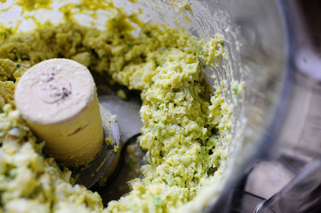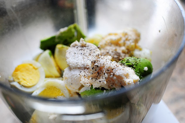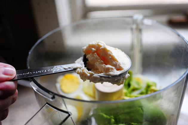 Bước 2: Tiếp đó, thêm 3 muỗng sốt mayonnaise, tiêu và muối vào cối xay để phần nhân sandwich vừa miệng hơn.