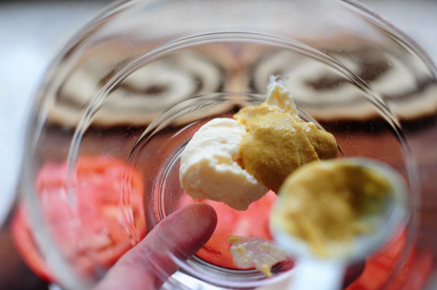 Bước 4: Bạn lấy 1 tô nhỏ, cho vào tô 1 muỗng canh sốt mayonnaise và 1 muỗng canh mù tạt (loại màu vàng), trộn đều 2 thành phần này.