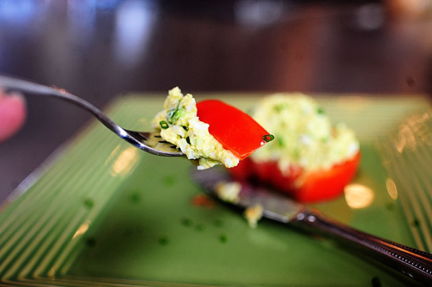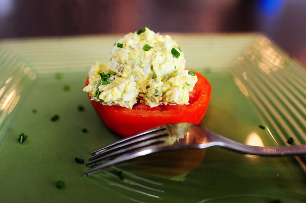 Với những ai không thích ăn kèm với bánh mì, bạn có thể biến tấu thành món salad với nhân là bơ trứng, và rau là cà chua. Rất tuyệt để thưởng thức nhé các bạn.