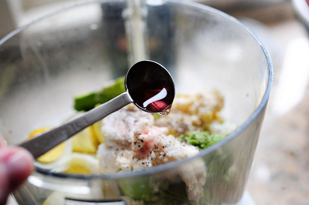 Bước 3: Để phần nhân được điều vị, các bạn thêm chút dấm ăn vào, sau đó xay đều các thành phần vào nhau.
