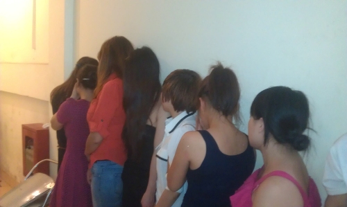 Các cô gái bị tạm giữ khi đang có hành vi mua bán dâm tại nhà nghỉ Sao Mai.