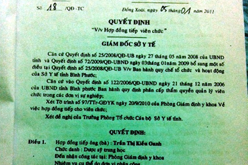 Theo những tài liệu mà chúng tôi có được, chị Oanh được Sở Y tế đã 3 lần ra quyết định “hợp đồng viên chức” chứ không phải thuộc dạng hợp đồng lao động như văn bản nêu.