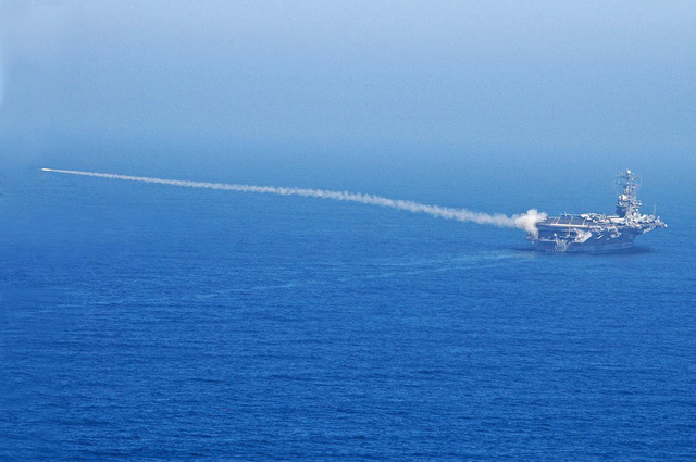| Tên lửa Sea Sparrow được phóng từ tàu sân bay lớp Nimitz USS Abraham Lincoln của Mỹ trong tập trận (Ảnh: US Navy) |