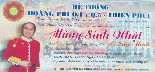 | Vé mời của cơ sở Hoàng Phi (Q.1) phát cho khách hàng tham dự sinh nhật Tổng tài Công ty Thiên Ngọc Minh Uy với những ngôn từ, trang phục "vua chúa". Ảnh Internet |