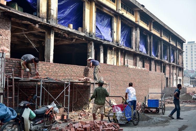 Phần tường phía bên ngoài đang được công nhân xây lại.