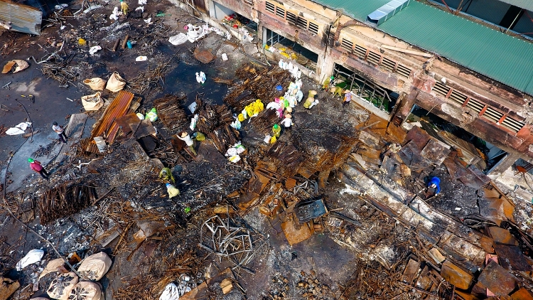 Ngày 3/10, nhiều công nhân vẫn đang tiến hành thu gom, dọn dẹp hiện trường vụ hỏa hoạn.