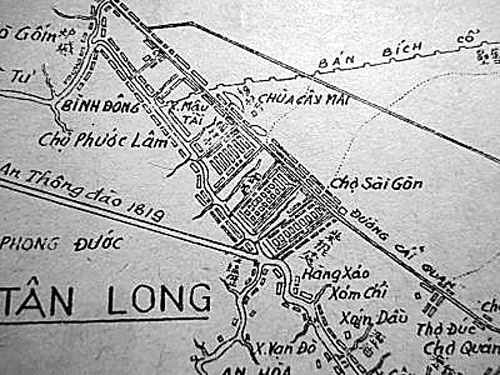 Vùng Sài Gòn (nay thuộc Quận 5, TP HCM) trên bản đồ “Gia Định tỉnh” do Trần Văn Học vẽ năm 1815, với ghi chú bằng 3 chữ 柴棍處 (“Sài Gòn xứ”), rồi 3 chữ quốc ngữ “Chợ Sài Gòn” do người đời sau thêm vào