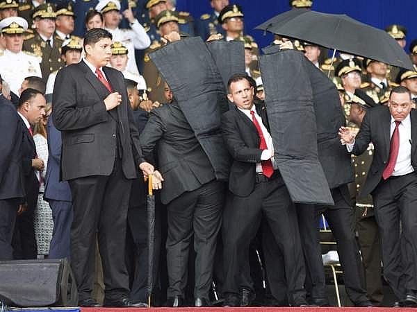 | Các vệ sĩ nhanh chóng lập hàng rào che chắn cho Tổng thống Maduro. |