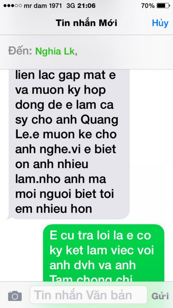 Mới đây, Mr Đàm đã vạch trần bộ mặt giả dối của Quang Lê khi đăng tải loạt tin nhắn của Nghĩa nhắn cho anh.
