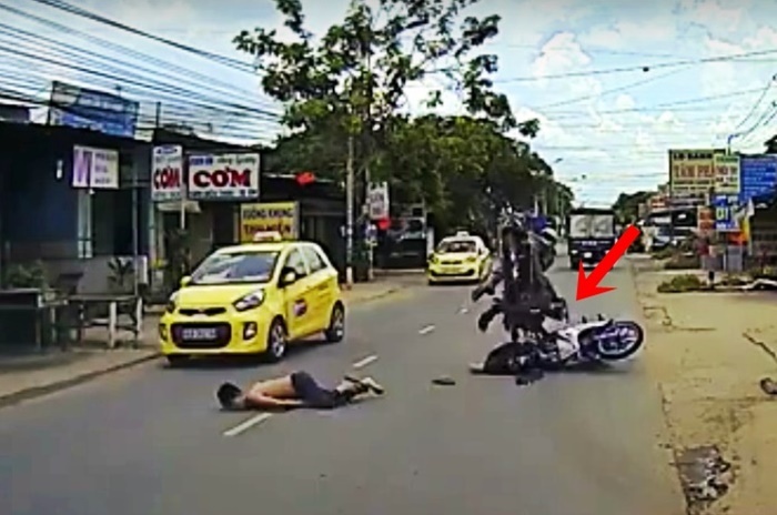 | Va chạm với xe taxi, xe máy ngã xuống đường, bị xe máy khác cán qua |