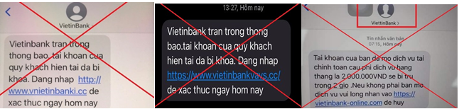 Thực tế đã xuất hiện trường hợp đối tượng lừa đảo với chiêu thức mạo danh VietinBank và gửi tin nhắn đến KH. Các tin nhắn này có thể gửi từ đầu số lạ hoặc mạo danh VietinBank, được nhận và lưu trong cùng mục với các tin nhắn của ngân hàng trên điện thoại di động của KH để thông báo tài khoản (TK) của KH có dấu hiệu hoạt động bất thường (đang bị tạm khóa, trừ phí)... Sau đó, hướng dẫn KH nhấp vào đường link trong tin nhắn để được hỗ trợ xử lý. Nhưng thực chất đây là đường link giả mạo, lừa đảo KH tiết lộ thông tin bảo mật như tên đăng nhập, mật khẩu, mã xác thực OTP… nhằm chiếm quyền kiểm soát và chiếm đoạt tiền trong TK của KH.