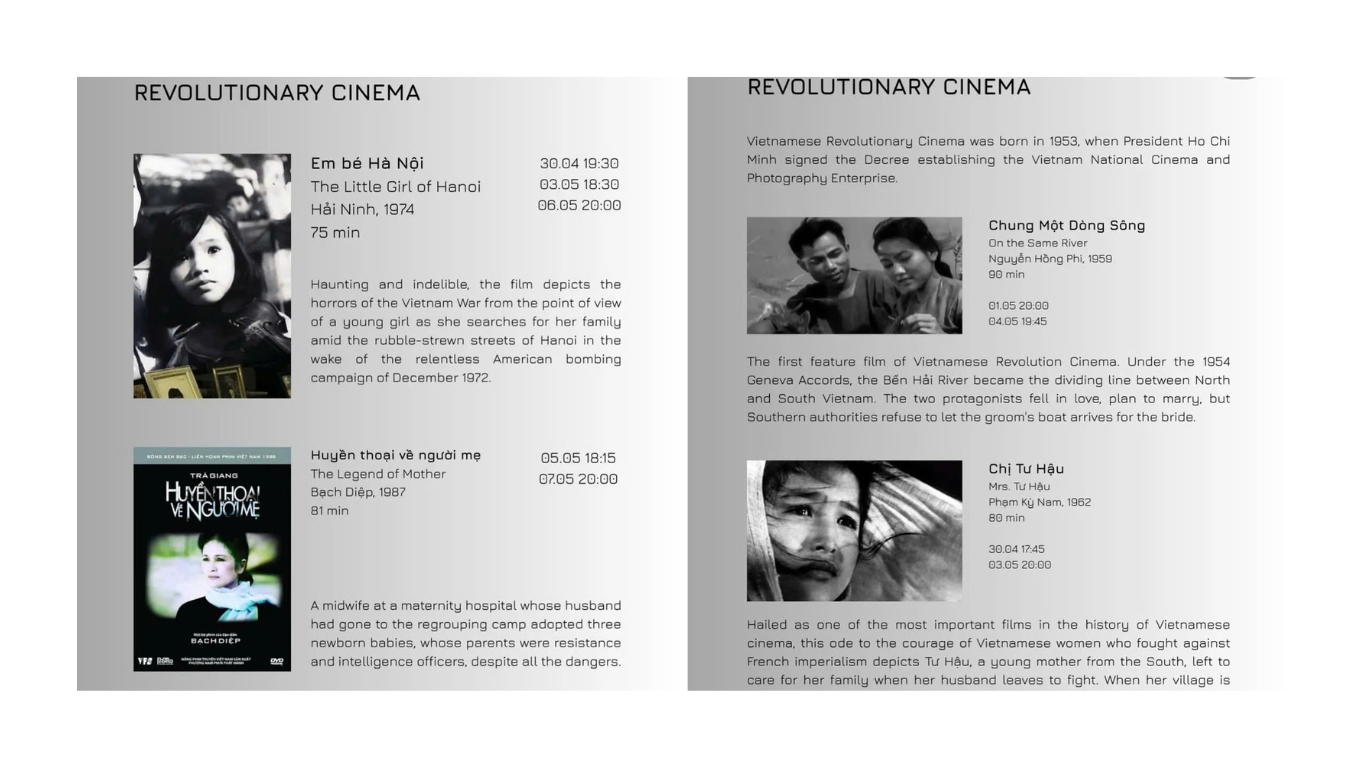 Song song với nhiếp ảnh, chương trình chiếu phim đặc biệt mang tên “Vietnam 50!” diễn ra tại rạp Babylon từ ngày 30/4 đến 7/5/2025, giới thiệu hơn 10 bộ phim Việt Nam từ thời kỳ chiến tranh đến hiện đại. Những tác phẩm như Chị Tư Hậu (1962), Em bé Hà Nội (1974), hay The Unburied Sounds of a Troubled Horizon (2022) không chỉ tái hiện hiện thực chiến tranh, mà còn thể hiện những nỗi đau, ảnh hưởng của cuộc chiến.