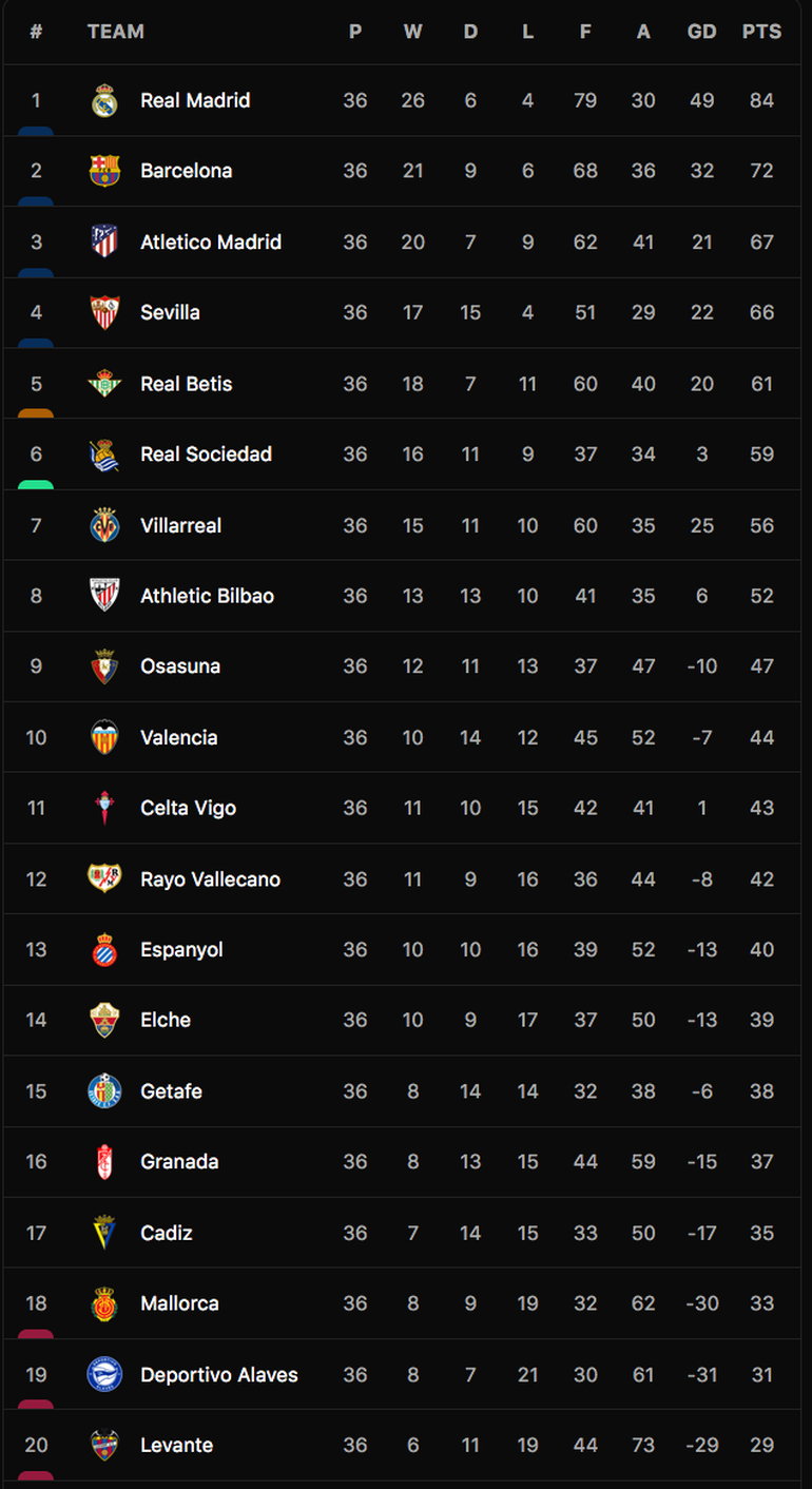 | Bảng xếp hạng La Liga 2021-22. |