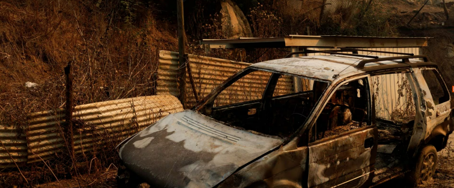 Phần còn lại của một chiếc xe bị cháy sau khi đám cháy lan rộng ở Vina del Mar, Chile, ngày 3/2