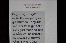 Trong số này, ông Hoàng Đức Cường (60 tuổi), Chánh văn phòng Đoàn Đại biểu Quốc hội tỉnh Quảng Trị nhận được tin nhắn từ số điện thoại lạ với nội dung có người muốn lấy mạng ông với giá 100 triệu đồng. Nếu chấp thuận, ông Cường sẽ rõ danh tính người đó cũng như những bằng chứng liên quan.