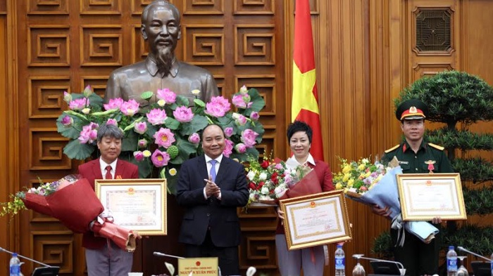 Cũng tại cuộc gặp, Thủ tướng Nguyễn Xuân Phúc đã gắn huân chương Lao động hạng nhất lên quân phục cho Hoàng Xuân Vinh.