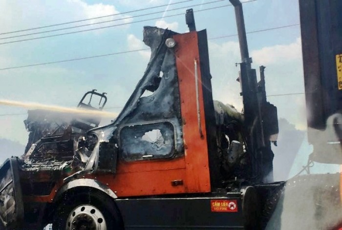 Xe container do tài xế Nguyễn Huy Tự điều khiển chạy trên cao tốc bất ngờ bốc cháy dữ dội, khói bốc lên ngùn ngụt ở đầu xe. Tài xế nhanh chóng cho xe tấp vào lề rồi thoát thân. Vài phút sau ngọn lửa nhanh chóng bao trùm và thiêu rụi toàn bộ cabin.