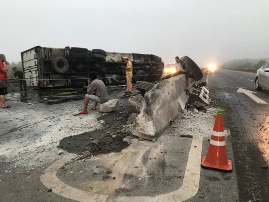 Xe đông lạnh lật ngang giữa Quốc lộ 1