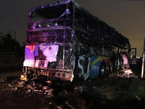 | Xe khách bị cháy rụi hoàn toàn. Ảnh: Phan Thành. |