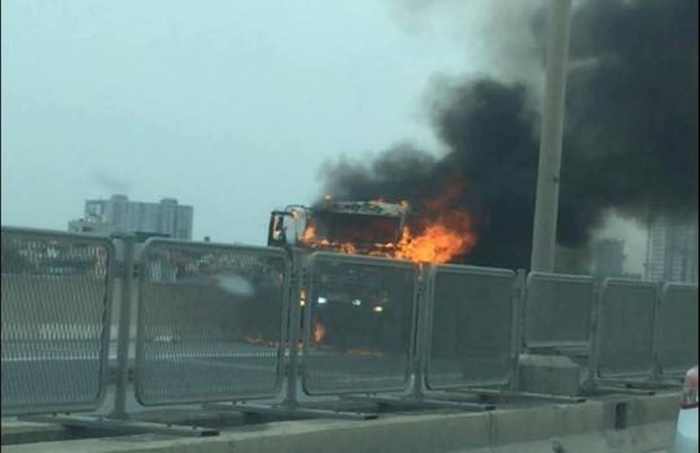 Đang lưu thông tại đường vành đai 3 trên cao, chiếc xe tải bỗng bốc cháy dữ dội.