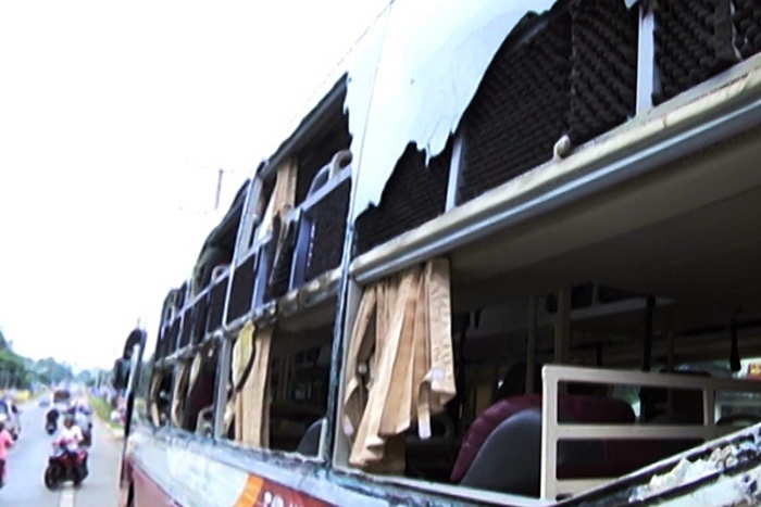 Cú va chạm khiến 39 người trên xe khách Thành Bưởi hoảng hốt. Toàn bộ phần kính bên hông xe khách vỡ nát làm 1 hành khách bị gãy tay. Danh tính nạn nhân bị thương được xác định là anh Phạm Văn Mạnh (SN 1984, ngụ TP Biên Hòa).