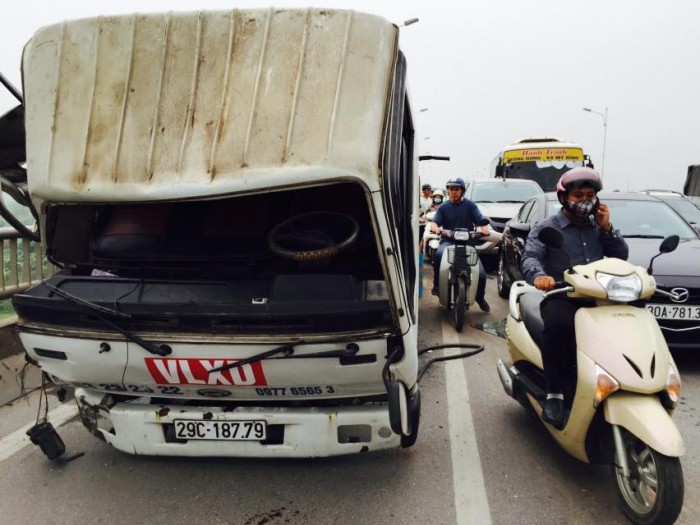Sự việc khiến lái xe tải bị thương nặng, được người dân đưa đi cấp cứu. Cầu Vĩnh Tuy ùn tắc nghiêm trọng theo hướng sang Long Biên.