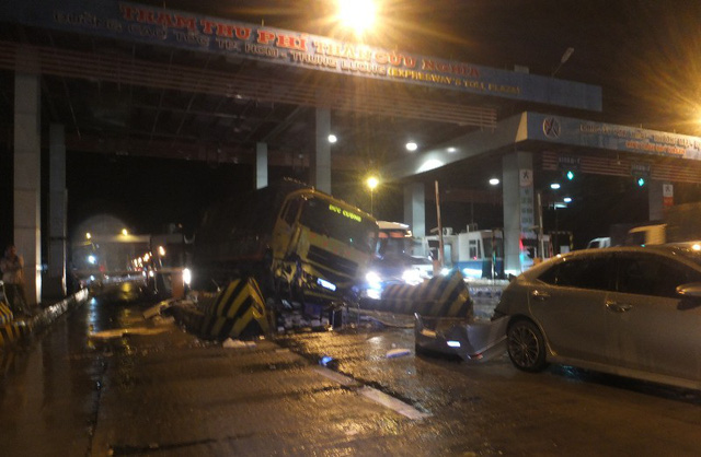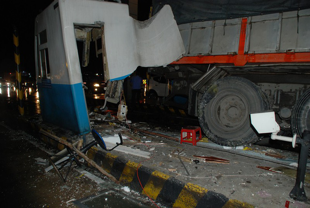 Tại hiện trường, xe tải 65C tông sập thanh chắn bảo vệ cabin và tông vỡ nát cabin thu phí. Sau cú tông, chiếc xe hư hỏng nặng phần đầu và gầm xe. Nhân viên thu phí may mắn thoát chết trong gang tấc, chỉ bị xây xát nhẹ. Xe tải nhỏ và xe 4 chỗ hư hỏng nặng.