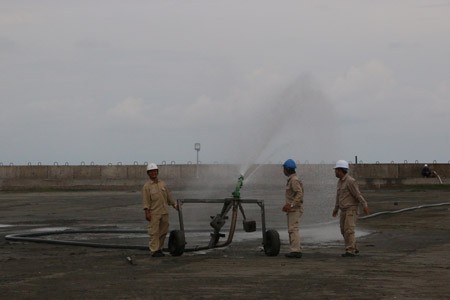 | Bãi chứa tro xỉ thải của nhà máy nhiệt điện Duyên Hải 1 luôn được lu, lèn phun nước tạo ẩm nhằm tránh phát tán bụi ra môi trường. Ảnh: VGP |