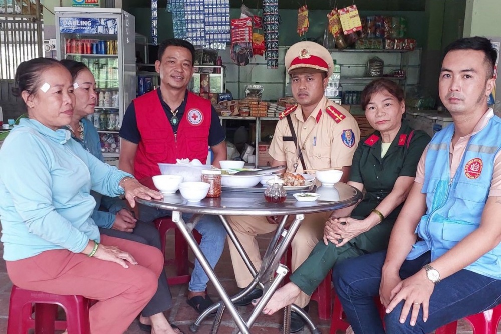 | Đại úy A Lăng Mạnh Hùng - Đội CSGT số 2, Phòng CSGT, Công an tỉnh Quảng Nam mời cơm đoàn đưa hài cốt liệt sĩ về quê. |